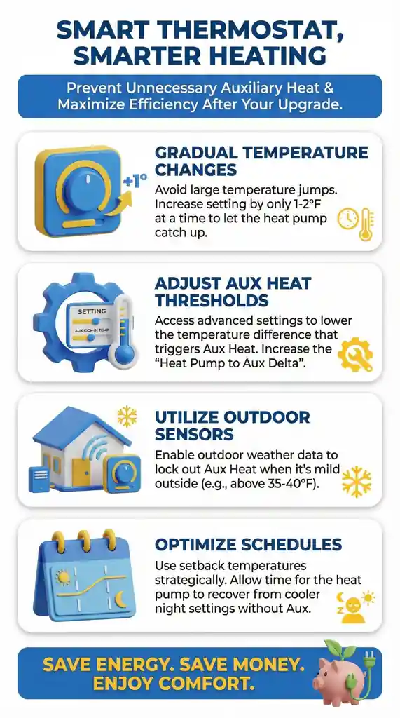 Result: Thermostat forces aux in moderate 50°F weather when heat pump should operate at peak 200-300% efficiency. Wastes $100-200 monthly.